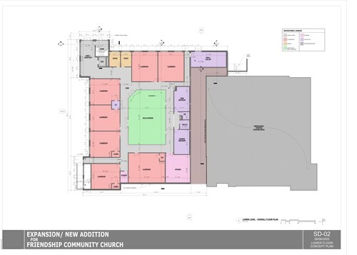 Welcome to the floor plans. Let's look at the lower-level floor plan SD-02. As you review this floor plan, please note several things. You will see 2 new offices, some storage and new ADA restrooms. Count the classrooms. There are (7) new classrooms that are sized to fit the needs of a typical public school room. A real effort has been made by the Architect for these rooms to have windows. Windows are also featured in the reception entrance lobby. The last thing we wanted to point out about this lower level is that in the middle there will be a large multi-purpose room which will have many uses and be equipped with a kitchenette. Can you find the ramp in this lower level?
